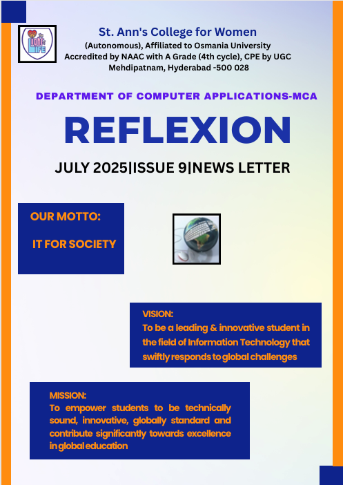 News letterHome »Departments »MCA »News letterDepartment of MCA NEWS LETTER 2024-25 2022-23 2021-22 2020-21 2019-20 2021-22 News letter Programmes offered Curriculum Program Outcomes Program Specific Outcomes / Course Outcomes Value Added Courses Department Faculty Profile Highlights and Achievements Activities Guest Lectures Conferences/Seminars Workshops/Training Programs Field visit Department Social Responsibility Student Projects /Internships Paper Presentation/Faculty News letter Media Collaboration MOUs Linkages Research Publications Projects Books authored Blogs Facebook
