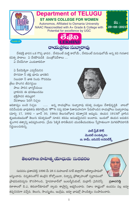 News letterHome » Departments » Telugu » News letterDepartment of Telugu News letter News letter Programmes offered Curriculum Program Outcomes Program Specific Outcomes / Course Outcomes Value Added Courses Department Faculty Profile Highlights and Achievements Activities Guest Lectures Conferences/Seminars Workshops/Training Programs Field visit Department Social Responsibility Student Projects /Internships Paper Presentation/Faculty News letter Media Collaboration MOUs Linkages Research Publications Projects Books authored Blogs Facebook